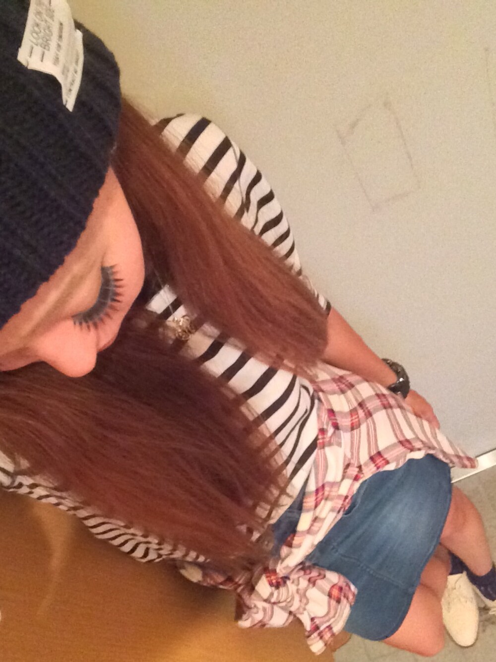 本日のお仕事着☆ スカート祭り開催中‼︎ ローラもおしてるハイウエストデニムタイトスカートを着用(n´—`n) ボーダーにチェックシャツってガチャガチャするイメージあるけど 案外可愛いのですヾ(´・∀・)ノ