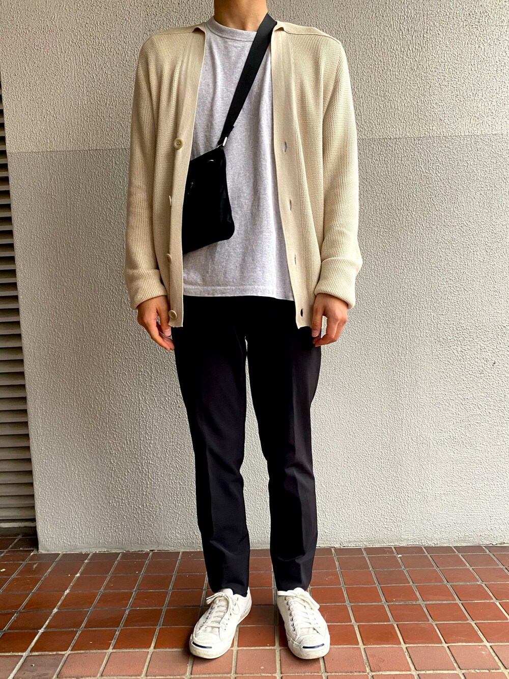 ジャージ素材のスラックスにオーバーサイズのカーディガンを羽織ってゆるく合わせました。