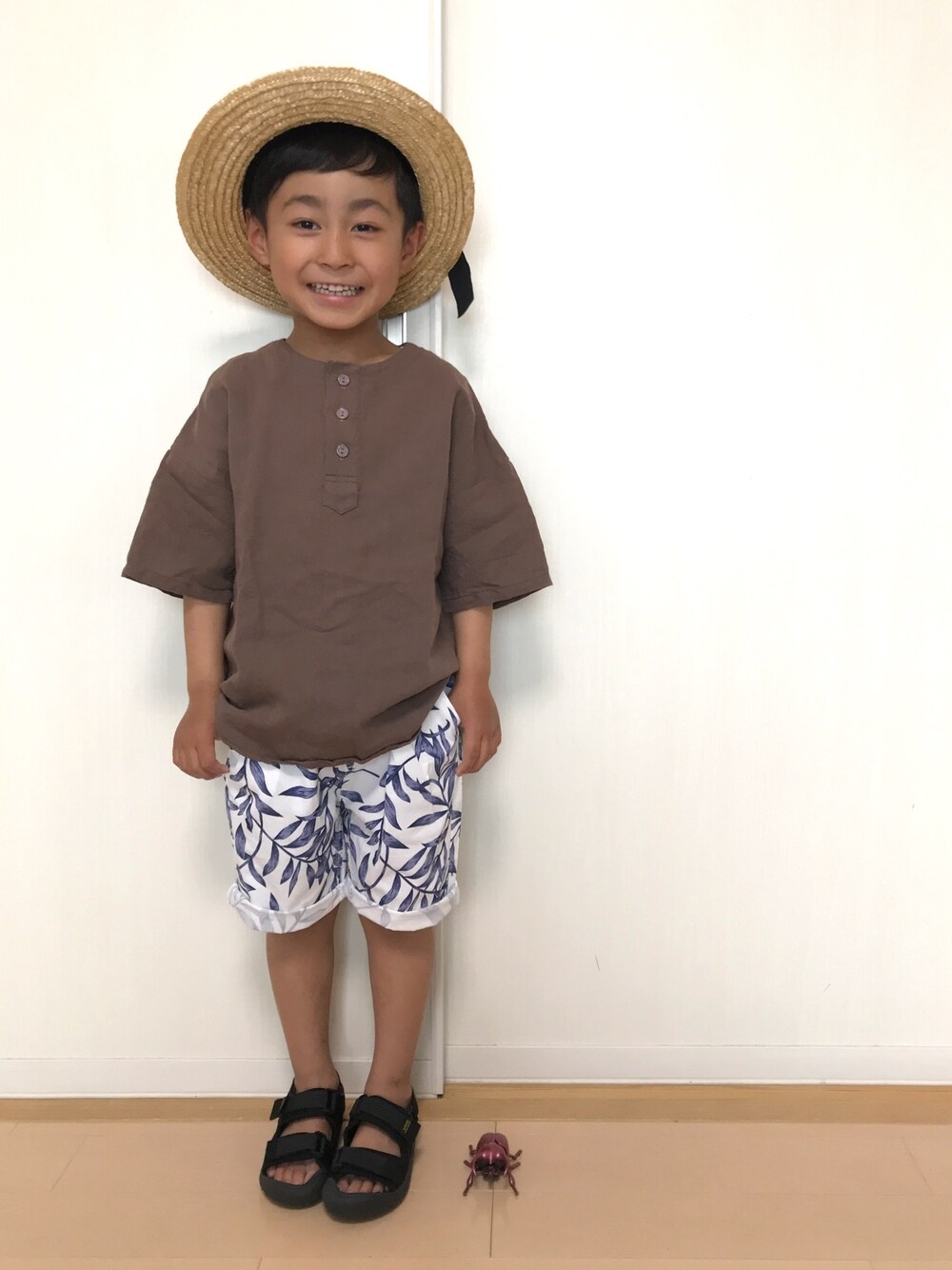 そらのすけ 5歳9ヶ月꒰๑͒ ु•ꇵ͒•`๑͒꒱ 107.6cm/16.9kg #おうちファッション 足元のクワガタムシのおかげで 虫取り小僧感。笑 去年の夏、ヒトメボレして買ったのに 大事にしすぎて出番が少なかったトップス。 今年は保育園にも着せてく!! サンダルもサイズアップで買ったお気に入り♡ 部屋撮りですっかり夏コーデ。笑