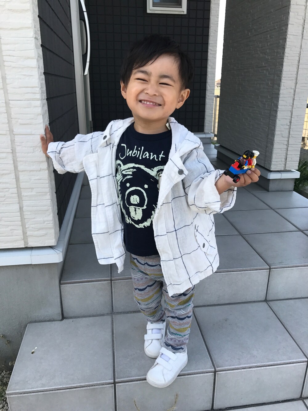 そらのすけ 2歳10ヶ月꒰๑͒ ु•ꇵ͒•`๑͒꒱ 久しぶりの保育園コーデ♡ めっちゃご機嫌で行きました♡ 中は半袖! 保育園行ったらお友だちみんなも半袖でした!