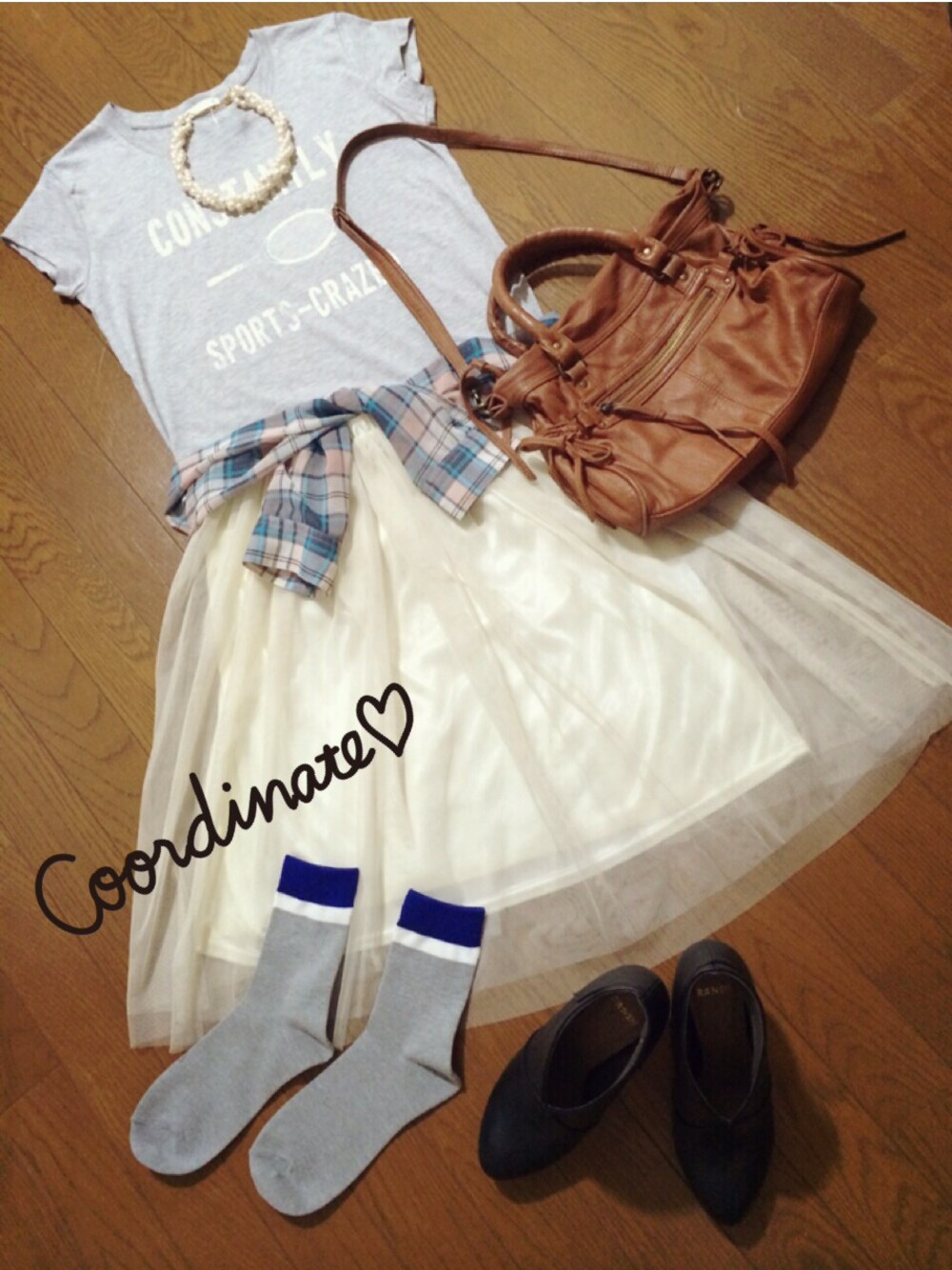 最近、腰巻きスタイルばっかり(*´ェ`*)♡ ANTREさんのチュールスカートとの相性もばっちり⑅◡̈*お気に入りです♡ Tシャツ:g.u スカート:ANTRE バッグ:ブランド不明