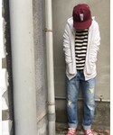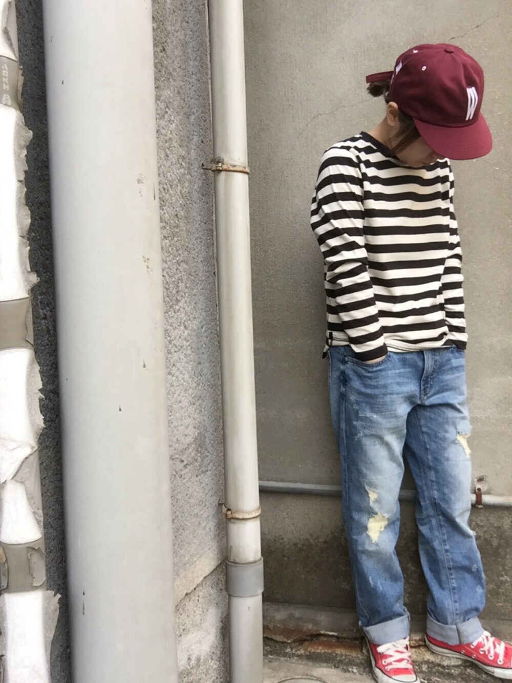 GUキッズのボーダーとUNIQLOのメンズデニム。ゆるい感じと色が好きです〜〜!フォロワーさんが気づけば500人超えててとっても嬉しいです🙏🙏
