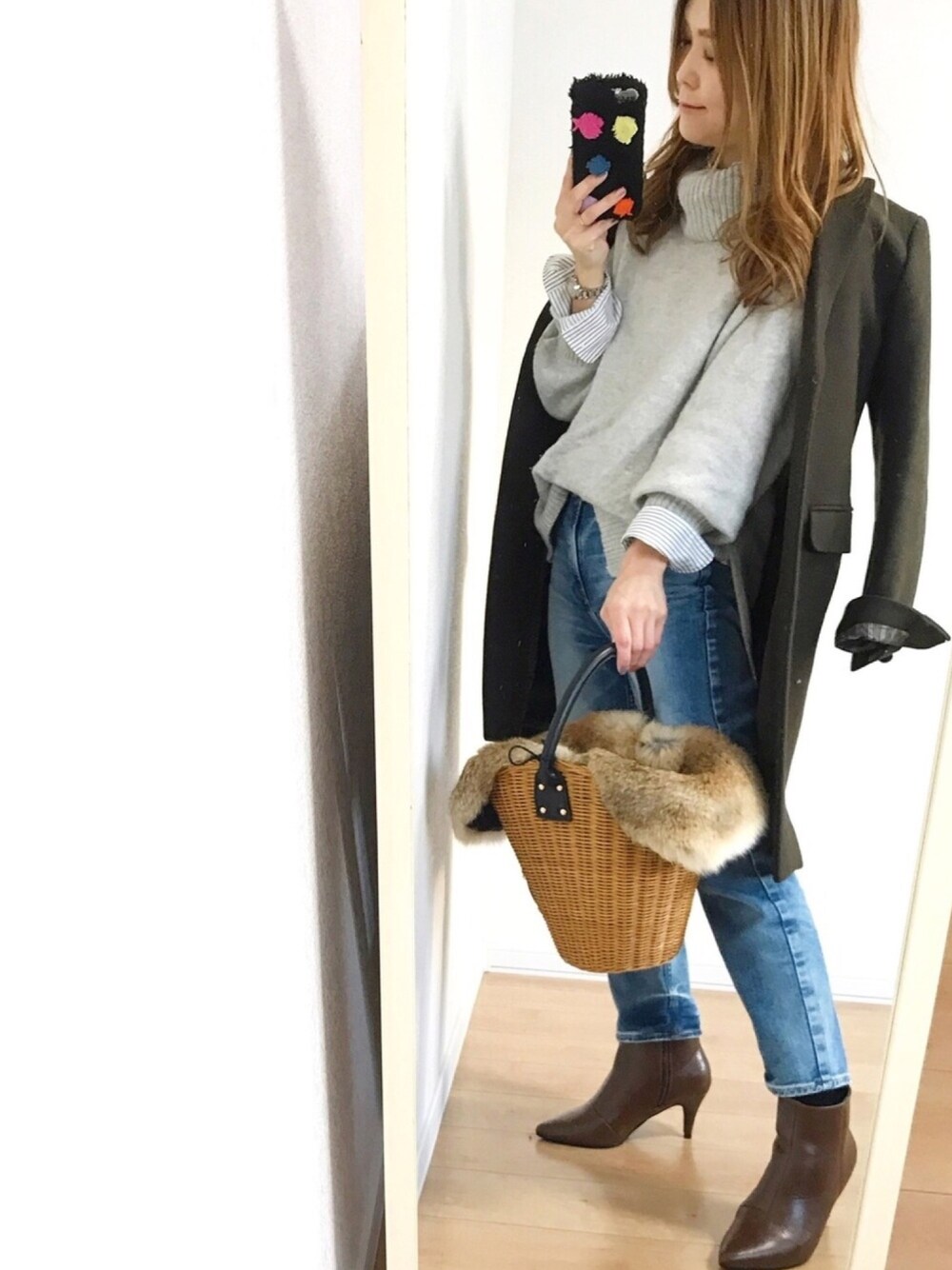 カーキ×グレー×デニム×ブラウン ストライプのシャツをチラッと♡ おはようございます☀ 何年か前のUNIQLOとイネスコラボの チェスターを久しぶりに♪ カーキの色味も、 さりげなく凝ってるデザインも お気に入りなので大事に着てます☺️💕