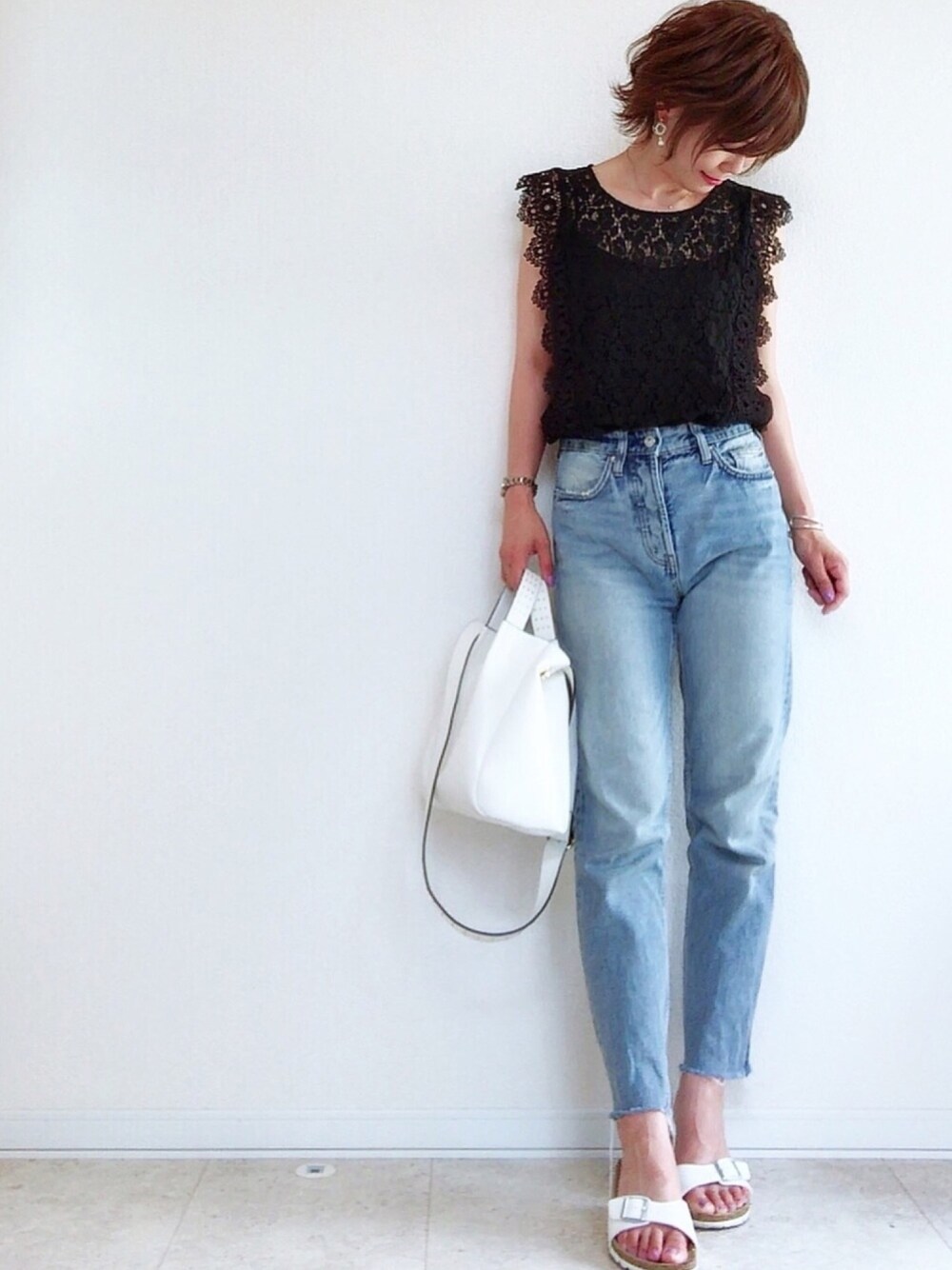 こんばんは♡ またまためずらしい時間に登場🙋♂️🍻 黒×ライトブルー×白 白フリフリはしっくり来ずだったけど 黒フリフリはまだ大丈夫な気が🙈💦笑♡ レースだから涼しいという大発見❤️ スキニーも穿きたくないから ゆるっとデニム合わせー🤤 小窓にぴーちゃんメイドのピアス💕 私の好みドンピシャでした💖