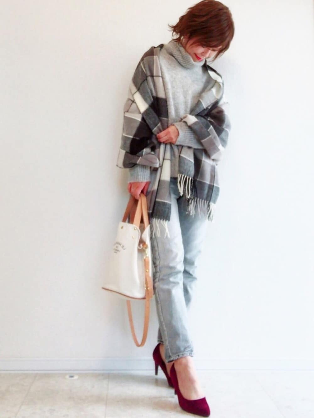 さやのストール/ショール「チェック柄大判ストール」を使ったコーディネート
