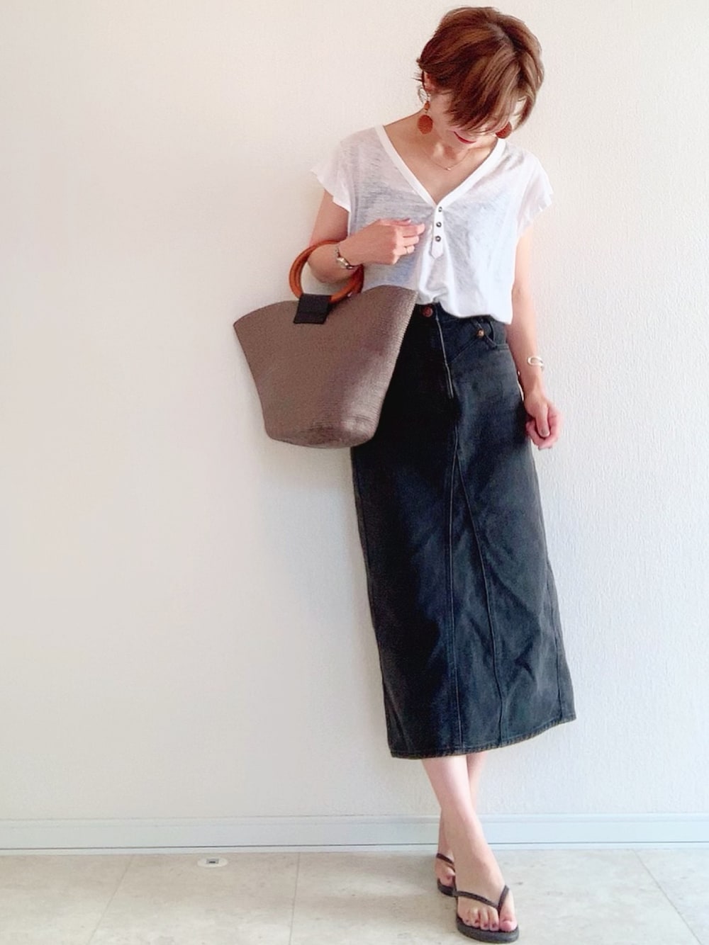 こんにちは☀️ 白×黒×ブラウン モノトーン、落ち着きますねぇ♡ ビーサンも楽ちんすぎて つい♡