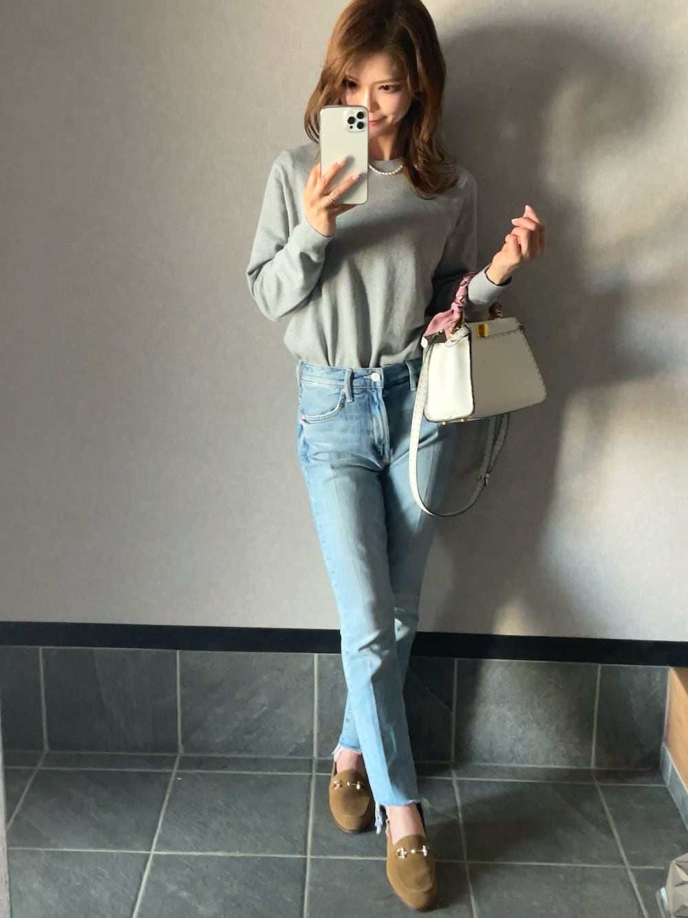 こんにちは❄️ グレーにライトブルーの好きな色合わせ♪ 限定価格になって即色違いで買ったニット😊 パールを合わせるのが好き♥