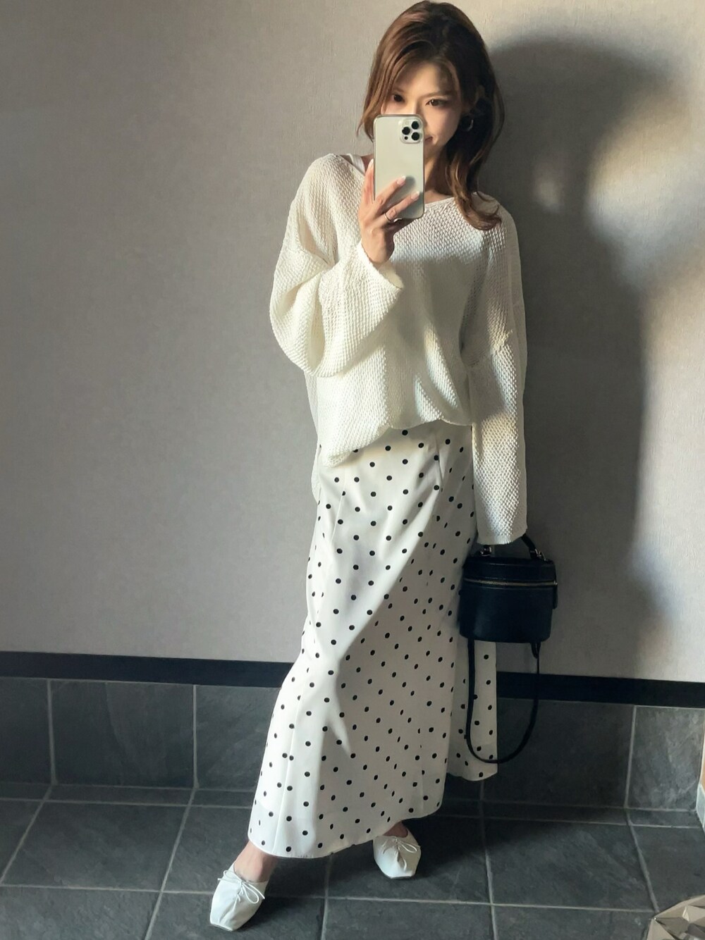 こんにちは☀️ あみあみが可愛いニットにドットスカート♥ 店員さんのコーデが可愛かったので 真似しました🐼♡
