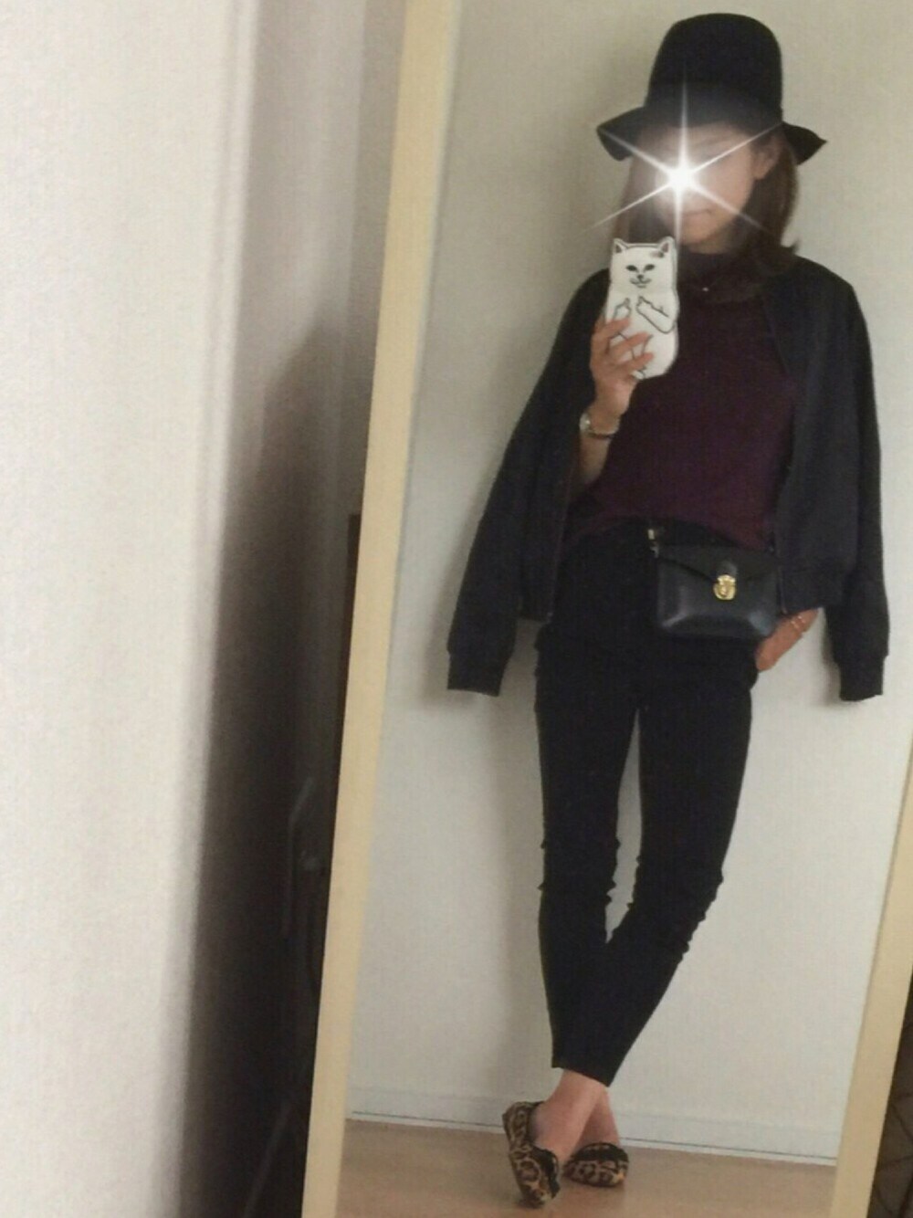 ブラック✖️ワイン♡ 今日は全身UNIQLOでした😊 なんだか暗かったので差し色にレオパード柄の靴を♡