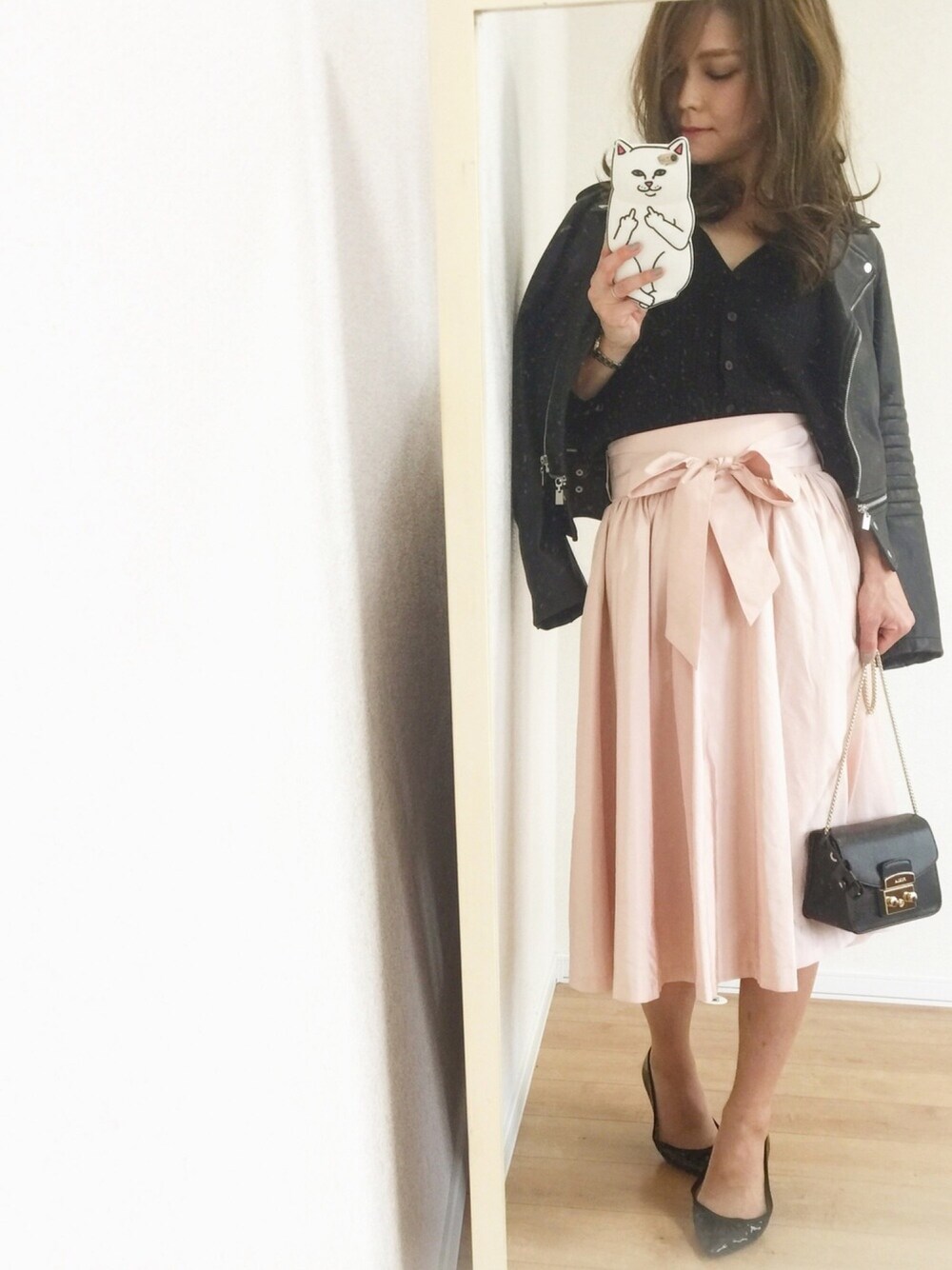 黒×ピンク 私にしてはかなり甘いスカートなので、いつものライダースで甘辛に☺️❤ 春ー🌸な色のスカートで楽しみにしてたお出かけに行ってきます🙋💕