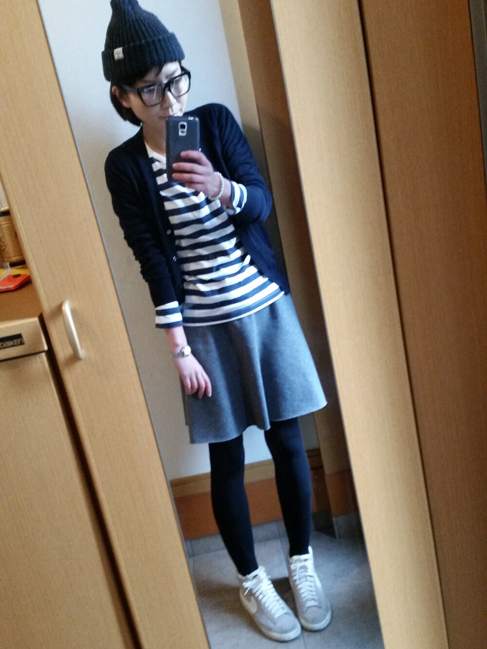 太いボーダーTシャツは無印良品。 この間久しぶりに無印良品行ったら、 春らしいアイテムがいっぱいで、 ほしいものだらけやった。 みなさんも行ってみて、無印良品。
