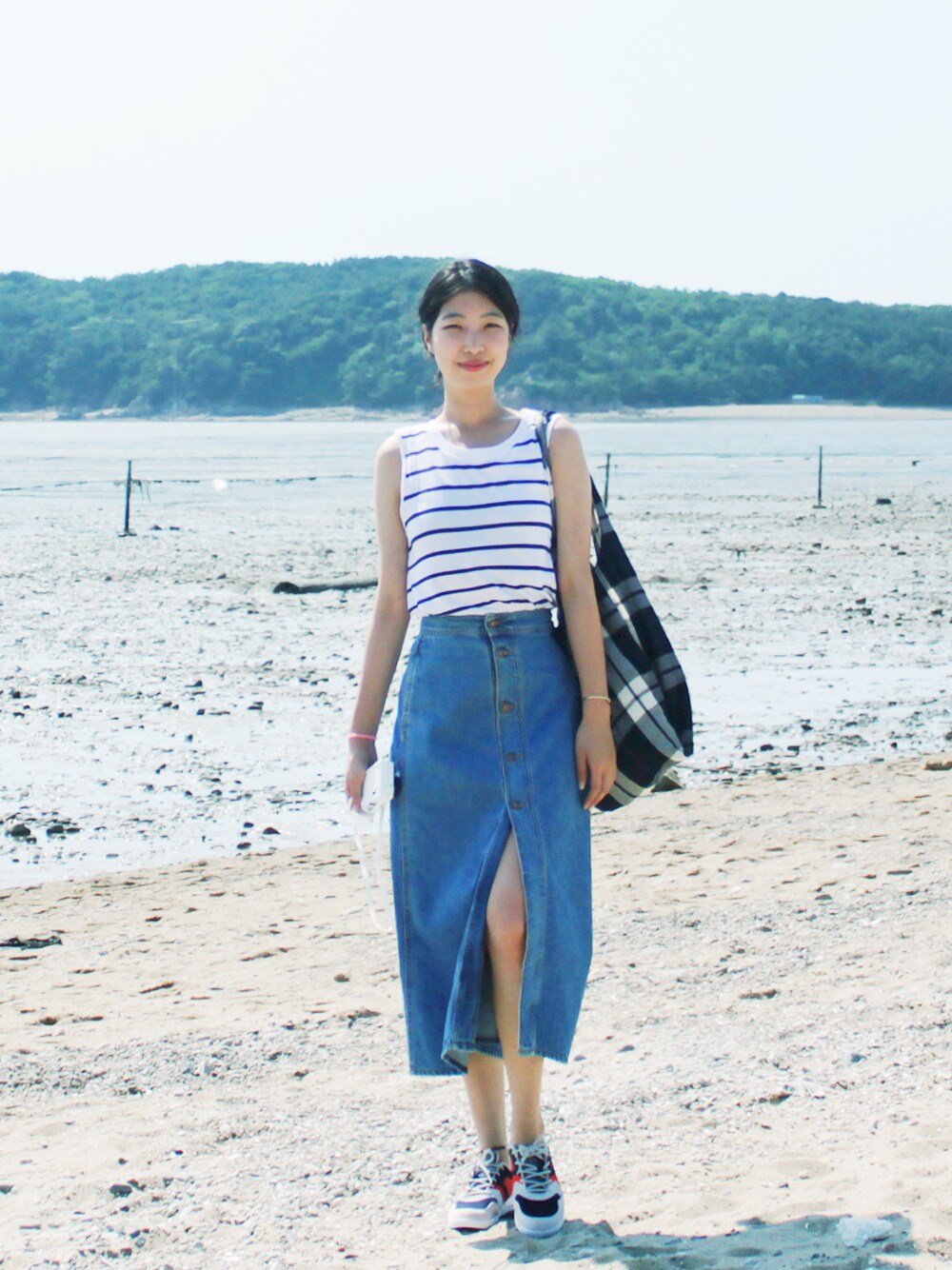 스트라이프 민소매티셔츠레 청코디로 쉬원한 데일리룩을 완성:^) 심심한 스타일에 오렌지 컬러로 포인트를 살려줬어요~! 스베누 아쿠아슈즈 쿠로 오렌지로 포인트!><