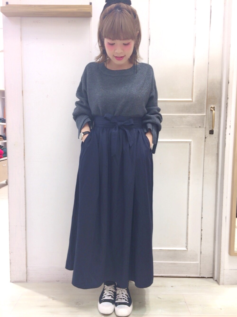 ご覧いただきありがとうございます! 新作のニットを使ったスタイルです✨ 袖にリボンが付いててゆったりとしたニット♡ スカートと合わせましたが ワイドパンツとの相性も良いですよ♡ 肌触りもいいのでぜひ お近くのお店で見てみてくださいね🧡