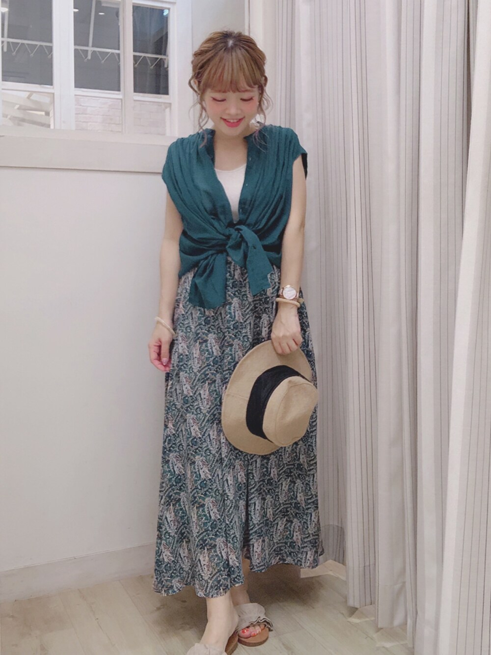 ご覧いただきありがとうございます! グリーンで統一したワントーンコーデ♡ ペイズリー柄が夏らしさをUP! ブラウスは裾を結んで ショート丈にしました♡ カジュアルだけど大人っぽさのあるstyle♡ ぜひお近くのお店でご覧下さいね\❤︎/