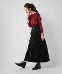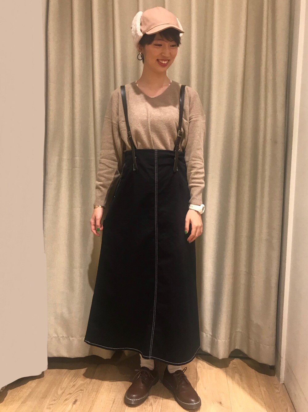 全体的に二色のトーンで合わせてまとまりあるコーデに!サスペンダー付きスカートはステッチが可愛い!