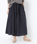 ドットパンツにロゴ入りのTシャツでカジュアルに。全体モノトーンの中でベージュのブルゾンを羽織ってコーデのポイントに!