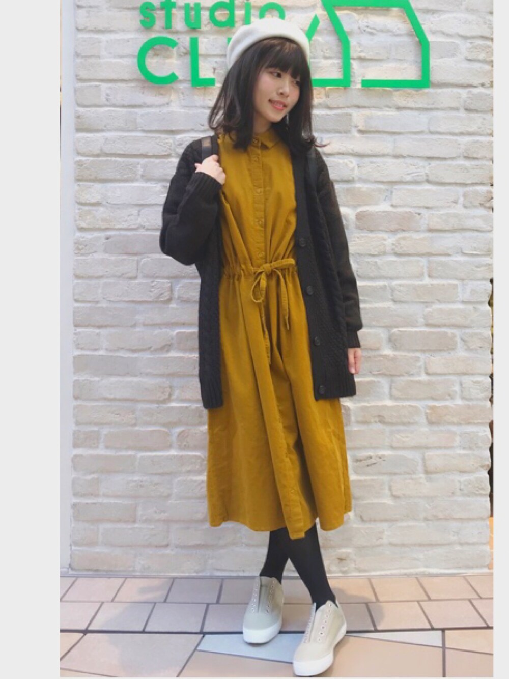 マスタードのワンピは今季大人気のコーデュロイ!肌触りもよく全体的に柔らかな印象を与えてくれる色味なのでカーディガンはブラウンでしめてスニーカーとリュックでメンズライクさもプラスさせました*