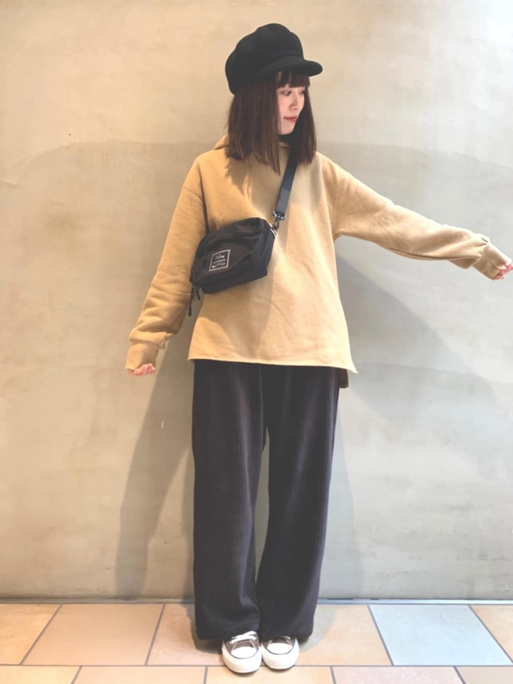 ビッグシルエットのフーディーは旬顔なコーデュロイパンツやスニーカー合わせでとことんカジュアルに☆ 秋らしいカラーリングのベージュをメインにし黒で締めたのもポイントです。