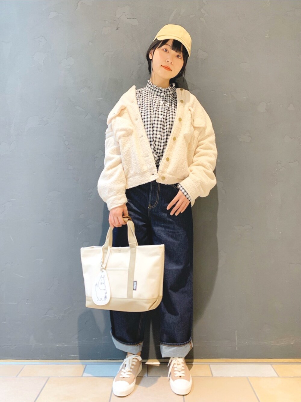 春の王道ブラウス×デニムパンツ! シンプルコーデもボアジャケットをゆるっと羽織って抜け感をプラスしましま☺︎
