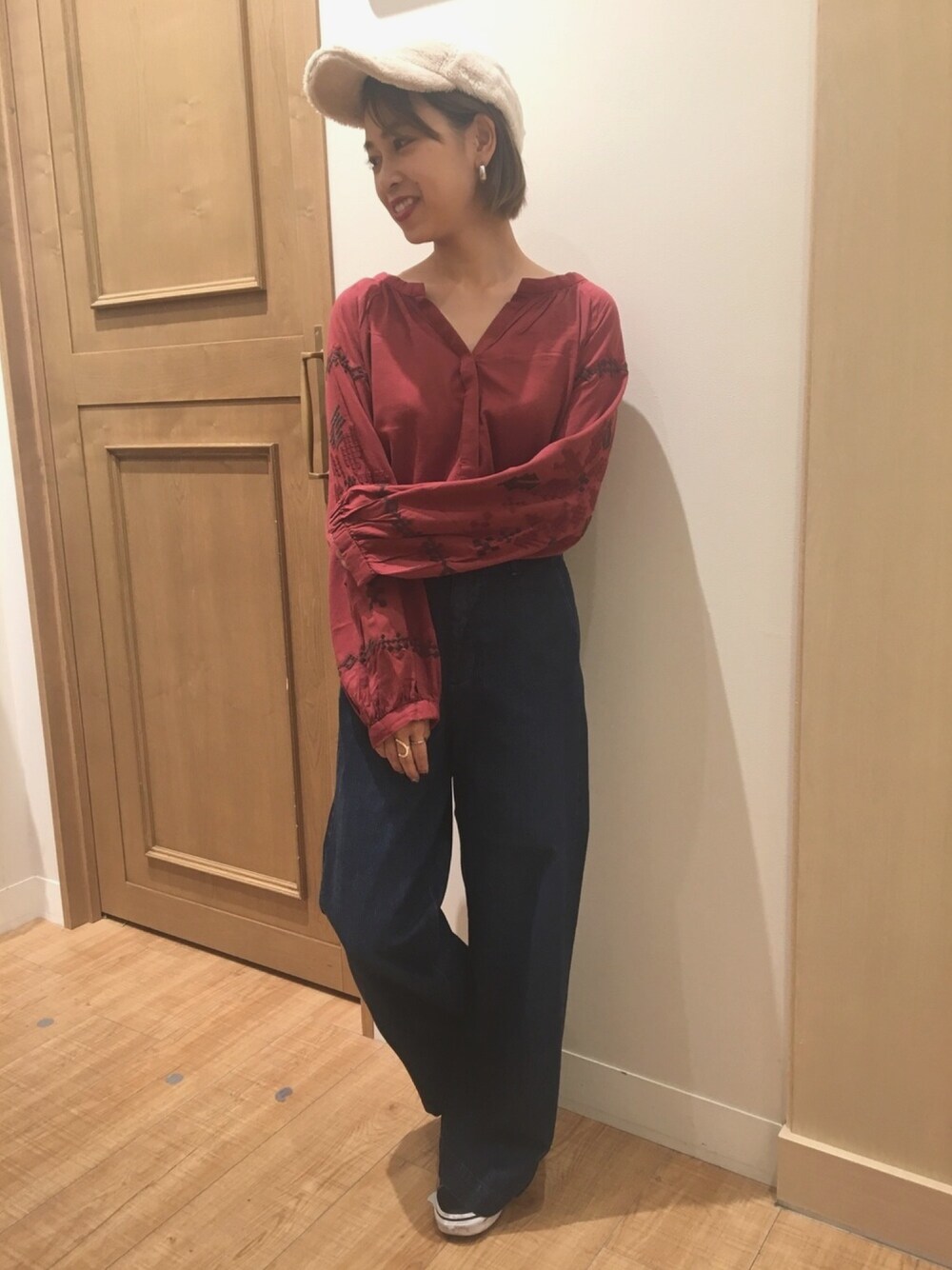 こんにちは◎ 富士宮店WEAR始めました😻 よろしくお願いします❤︎ 初回は人気のはまじコラボブラウスが主役のスタイリングです! 袖のボリューム感がかわいくて、刺繍も幾何学柄なのでかわいすぎないところがポイントです😌 デニムと合わせてカジュアルなスタイリングがおすすめですよ❤︎