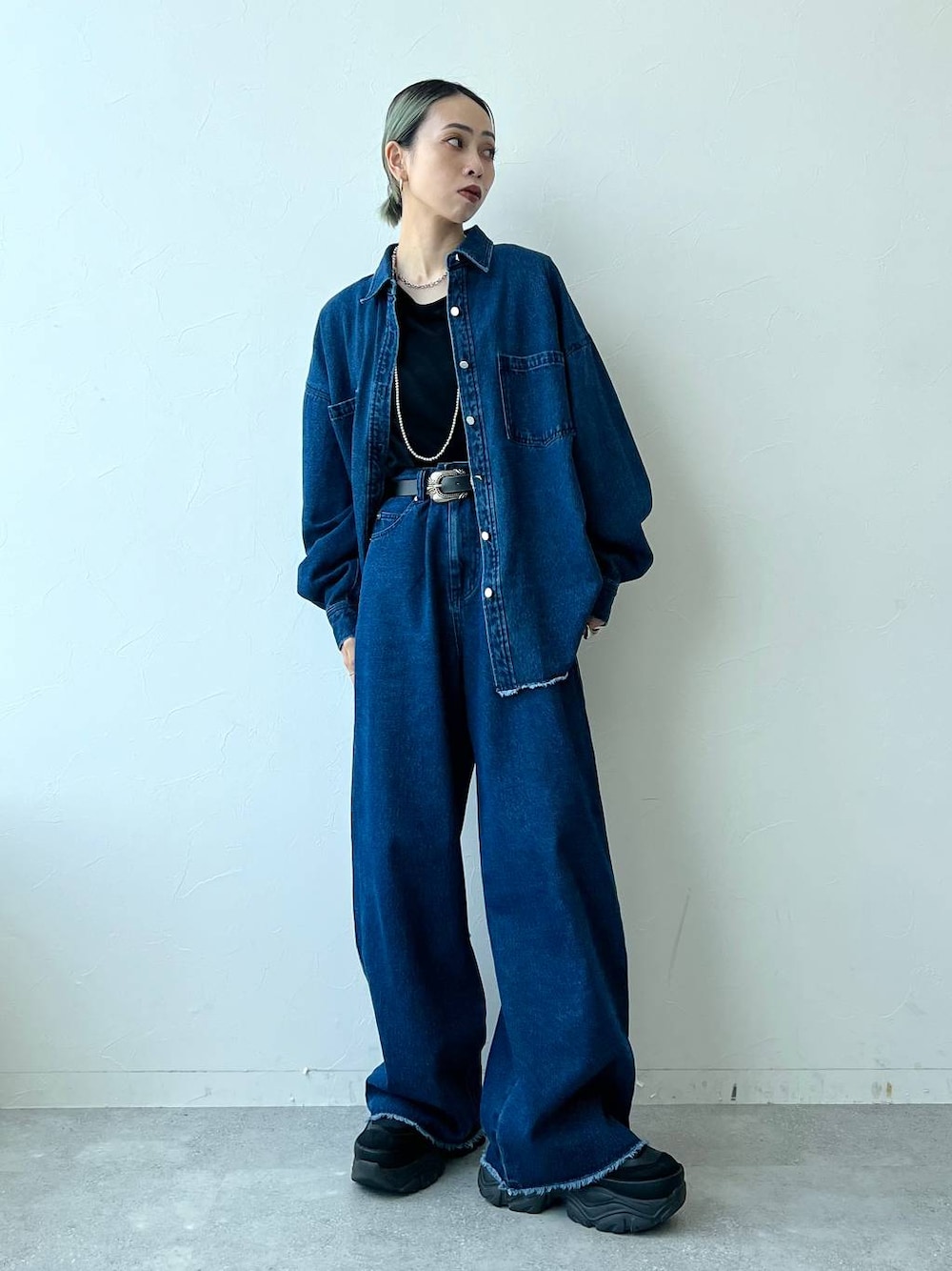 秋に持っておきたいデニムセットアップ! シャツはフリーサイズ、パンツはMサイズ着用! 厚底合わせなくてもMサイズで丈は大丈夫そうでした!