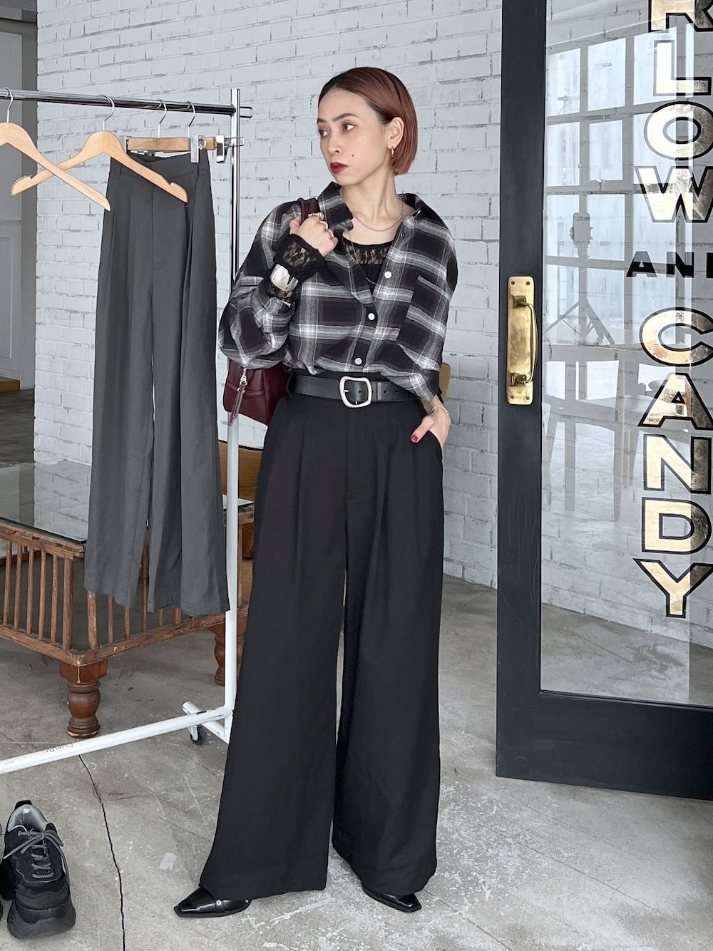 チェックシャツ▶︎丈は長め!ゆったりめ、袖長めなので、低身長さんは首と手首を出して抜け感のある着方がおすすめ◎ガーゼのような素材で透け感があるので、重宝すること間違いなし! インしてもごわつかない素材なので、低身長さんはインするとバランス◎ パンツ▶︎coming soon!お楽しみに!
