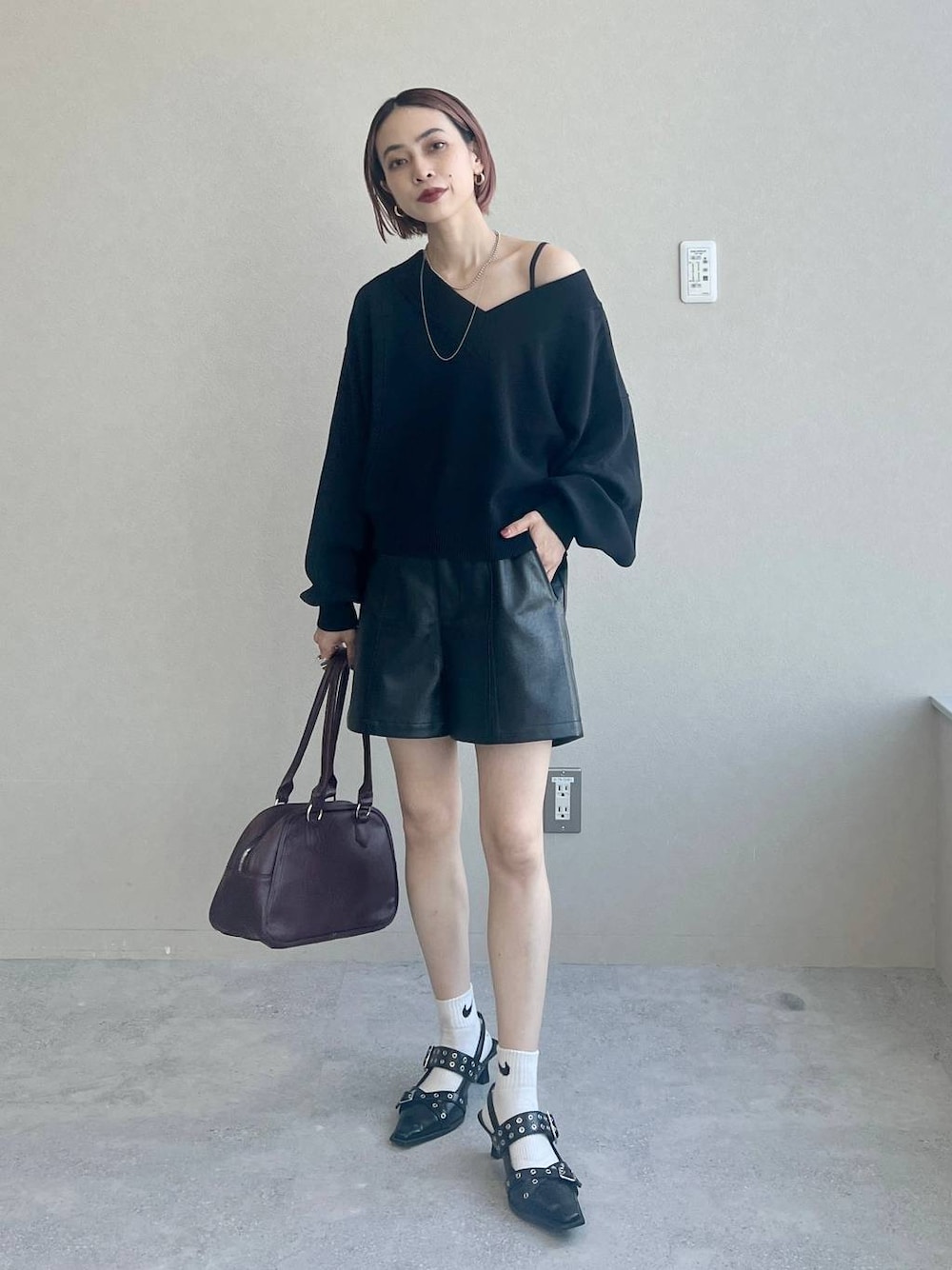 ニット▶︎シンプルでマルチに着られるニット!もちっとした記事でチクチク感もなく肌触り◎ オフショルにしても大人っぼく着られる! ショート丈はインしなくてもバランス取れるから、低身長さんにもおすすめ! パンツ▶︎coming soon! フェイクレザーで、ショートパンツでも子供っぽくならず大人シンプルに使えるアイテム! ブラックコーデをしても素材感で重たくなりません!