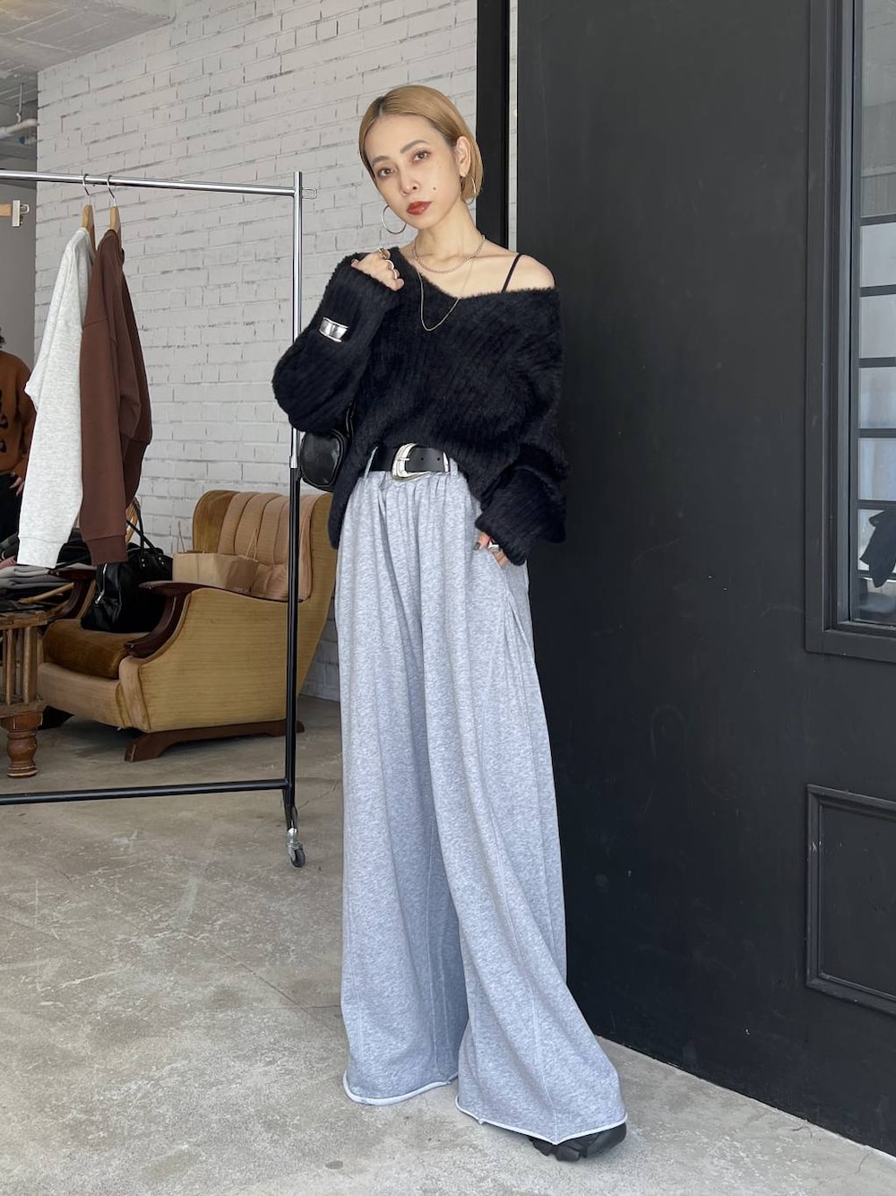ニット▶︎シャギーニットは女らしさを格上げしてくれる!ワンショルじゃなくても着られるので、世代問わず!インナーはキャミ着てるけど、チクチク感はゼロ! パンツ▶︎154cmでMサイズ着用。厚底ブーツと合わせたかったからワンサイズアップで穿いてますが、ジャストサイズはS!