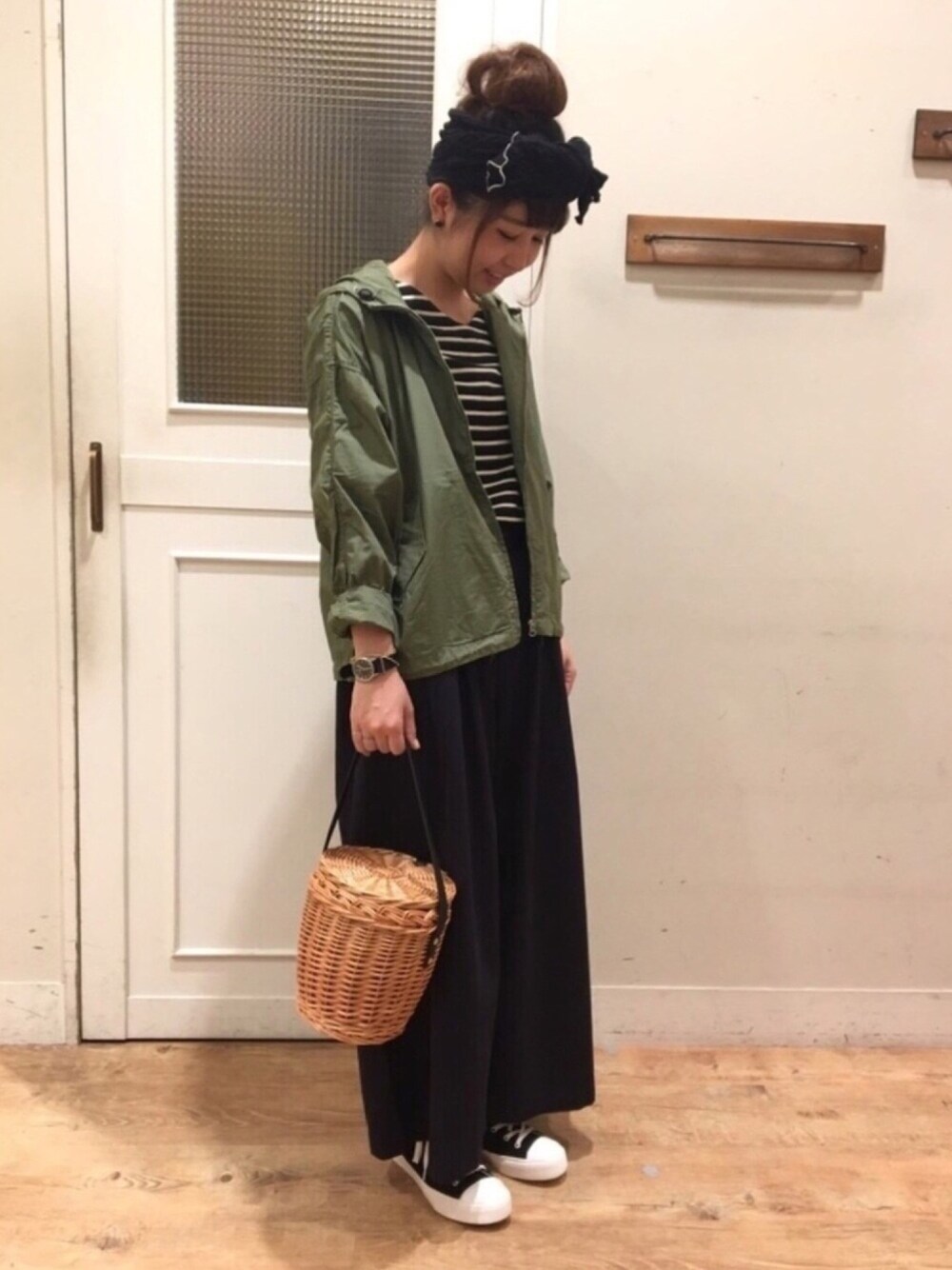 1つ前のコーディネートでご紹介した、 パンツのワイドパンツバージョンです☆ 少し朝晩が涼しくなってきたので、、、 薄手のマウンテンパーカーと合わせてみました! 後ろにボリュームがあるので 腰回りをしっかりとカバーできます♩ カゴバッグを合わせると今年らしいスタイルに☆