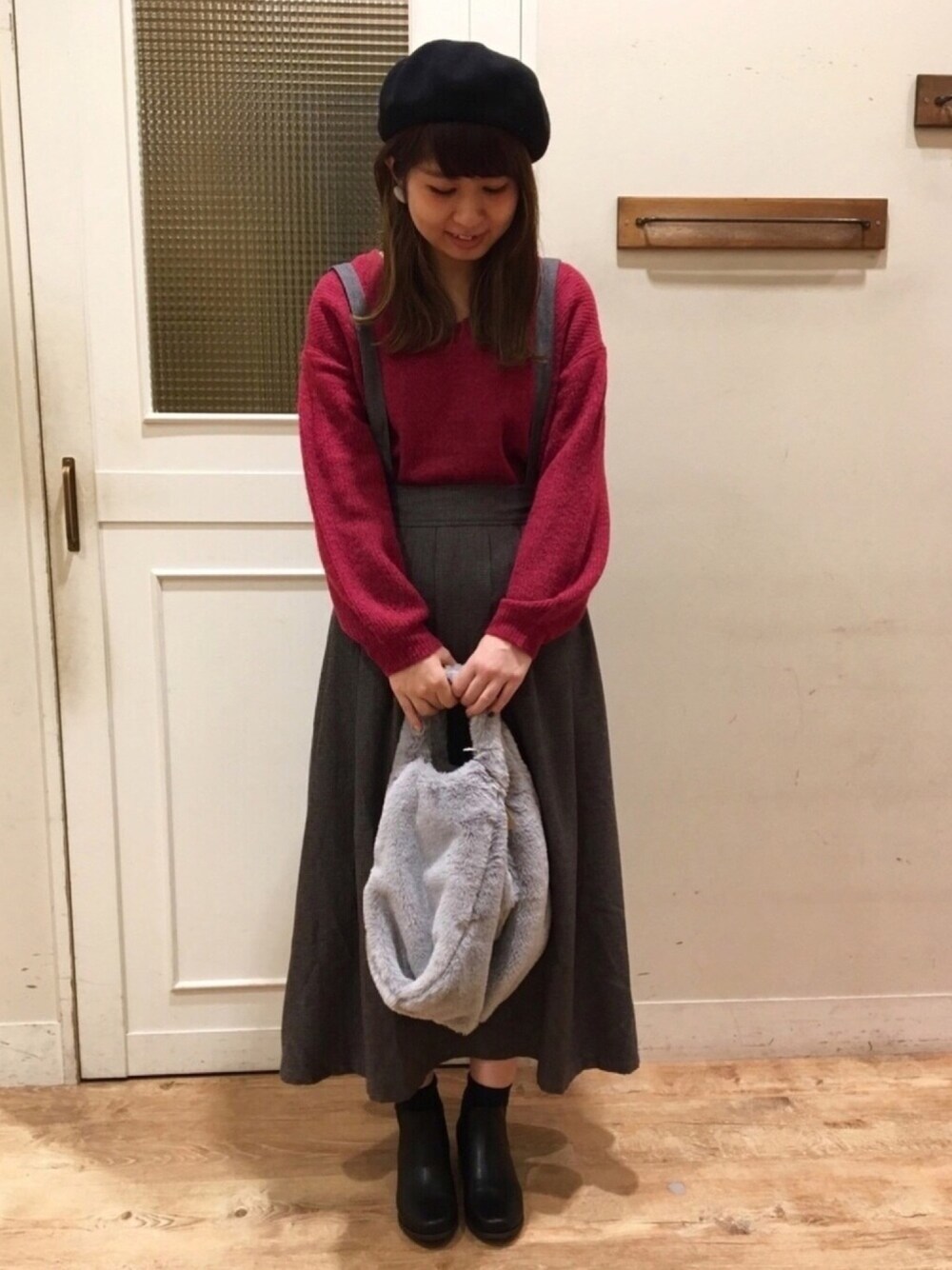 マカロンニットコーディネート第2弾◎ 本日はレッドです🍓🍎🍅 明るく存在感があり少しワイン色に近い色味。 シックな千鳥柄スカートと合わせてみました♩ こちらのスカートは1つ前にご紹介したサロペットと同じ柄のグレンチェックもご用意しております👗✨