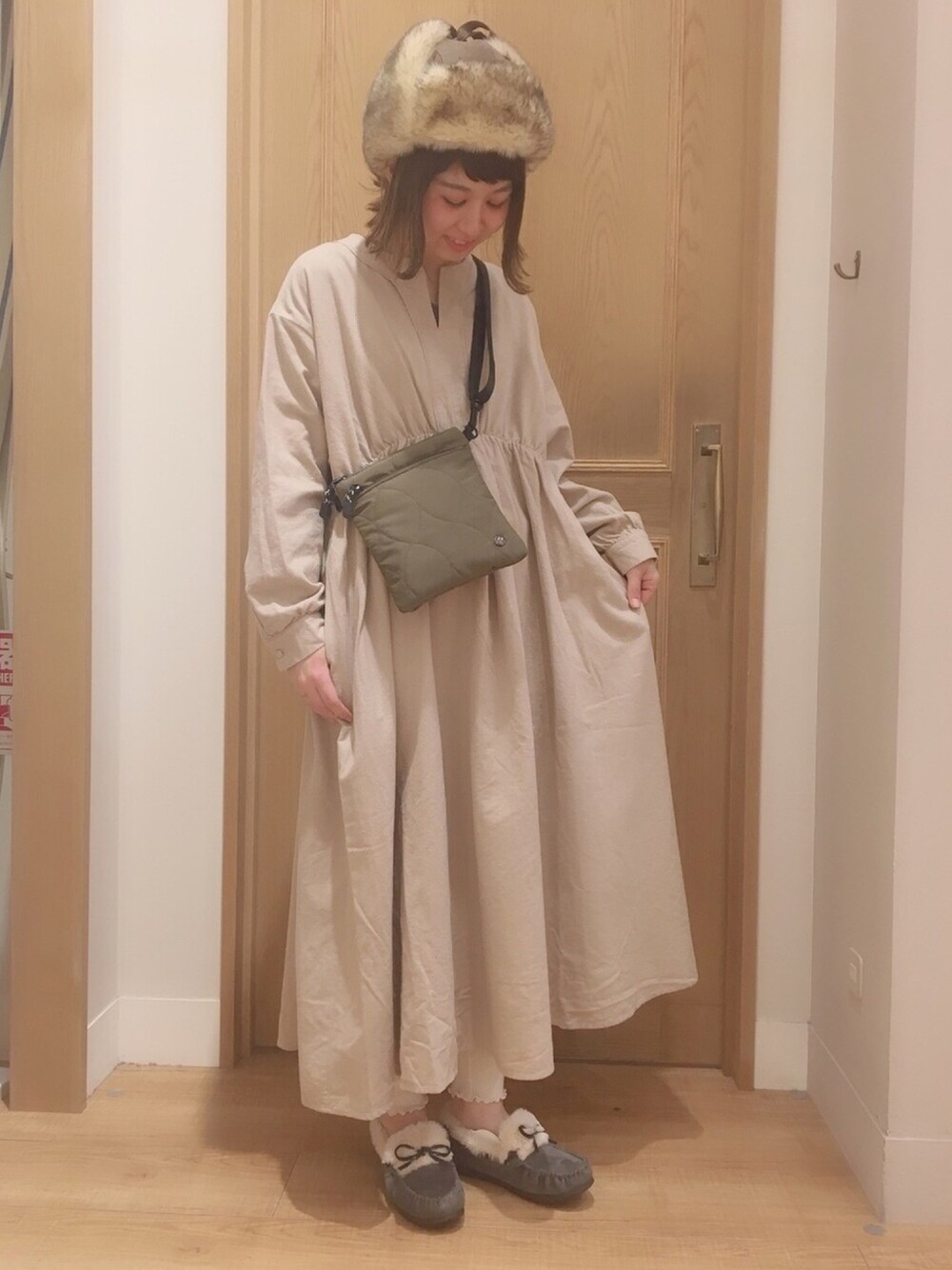大人気の起毛ワンピース♡ 丈がたっぷり長いので1枚でさらっと着るのがおすすめです👗 サコッシュやパイロットキャップを合わせると かわいらしくなりすぎずカジュアルスタイルになります🧸💞