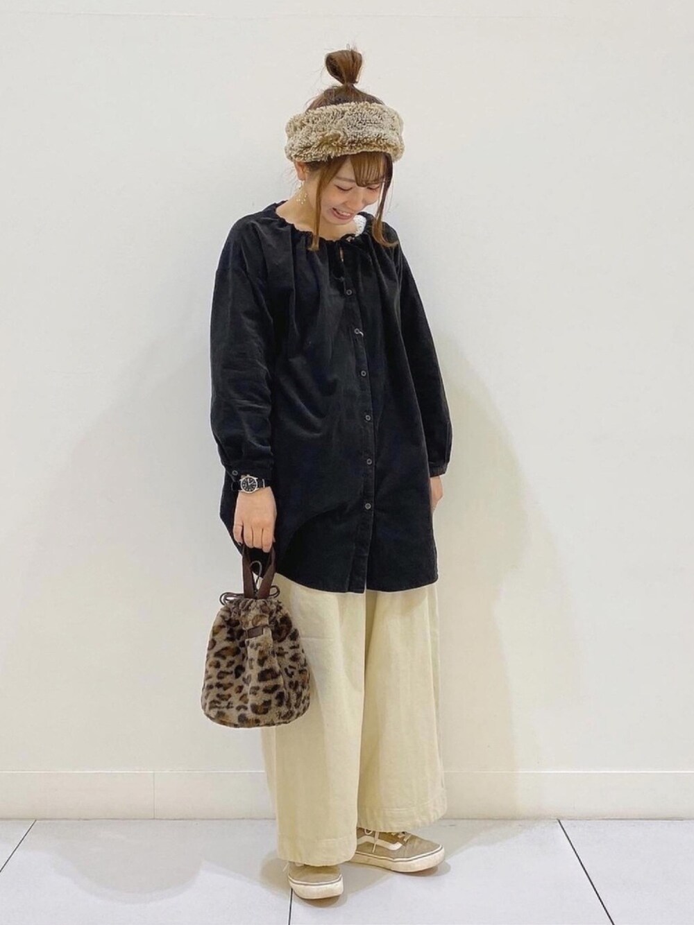 首元のリボンがかわいいチュニック 。 ワイドパンツと合わせてゆるゆるスタイルに そして シンプルなコーデには アニマル柄の巾着バッグを ♩