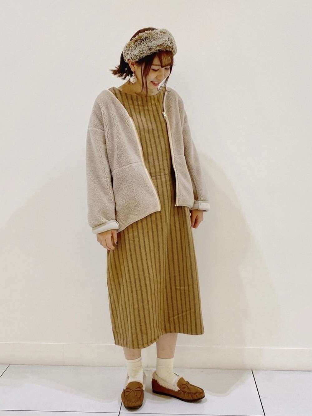 ブラウンのワントーンコーデ 。 ボアブルゾンは優しい色味なので 柔らかくナチュラルな印象に ☺︎ ストライプワンピースは 縦のシルエットが綺麗にみえます 😲🤎
