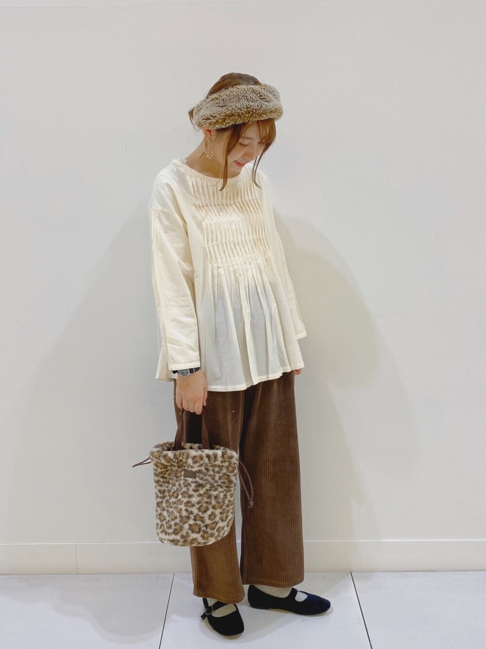 胸元のギャザーがかわいいブラウス ♡ 真っ白ではない色味なので ブラウンのパンツとも相性◎です !