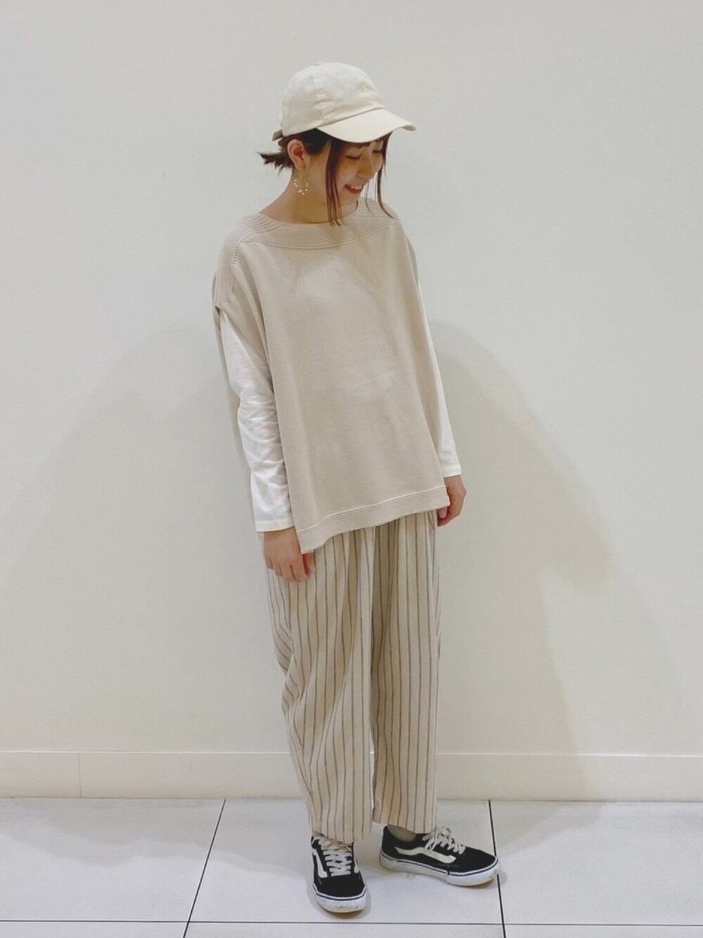 イージーパンツとベストでカジュアルコーデ ☺︎ ストライプのパンツは ゆるっとして体型カバーもしてくれます ♩