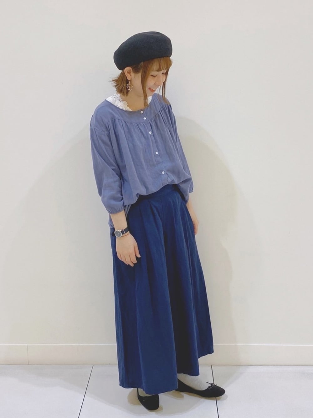 優しい素材感のブラウスとスカーチョ 。 ネイビーカラーでも春らしく合わせていただけます ♡