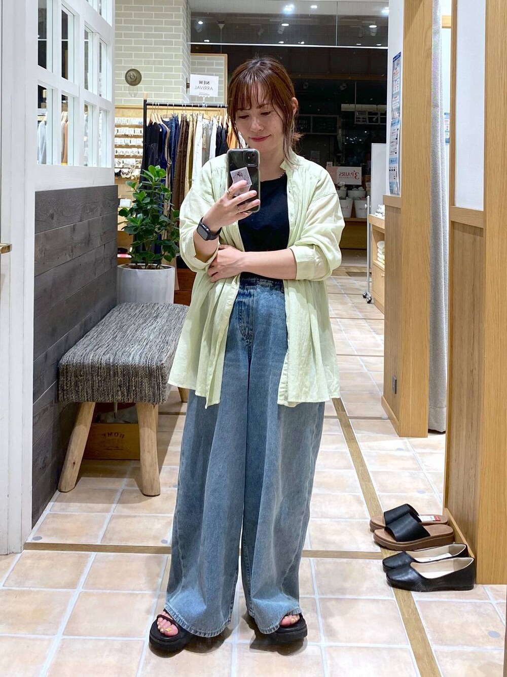 ⭐各アイテムのおすすめポイント  ̄ ̄ ̄ ̄ ̄ ̄ ̄ ̄ ̄ ̄ ̄ ̄ ̄ ̄ ̄ ̄ ̄ 【トップス】 シアーシャツは長袖なので日除けや冷房対策、これからの初秋にもおすすめ♪ 後ろにはギャザーが入ってるでふわっと広がりバックスタイルも綺麗に見せてくれます♡ 【ボトムス】 デニムはゆったりとしたワイドパンツでSサイズでちょっと長く感じますが厚底サンダルやウエストを折り返したり、裾をロールアップすればOK(^^) ベーシックなインディゴブルーをお持ちの方に2本目としておすすめしたいカラーです♡ Instagramはこちらから☞