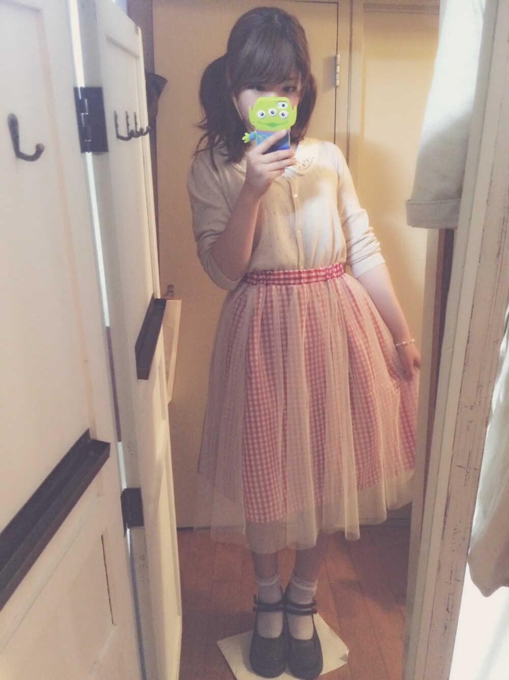 中がギンガムチェックのチュールスカートを履いたよ!確か¥1500くらいでとっても安かったのです(°_°)笑 メルヘンな感じにまとめました♪ カーディガン-Honeys インナー-THE EMPORIUM