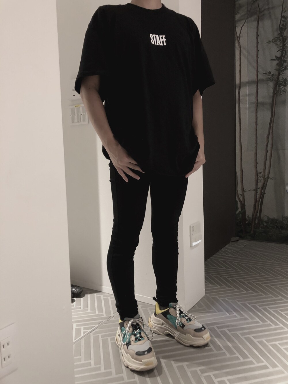 この頃バイト続きで投稿できませんでした… staffT女子受け悪いです!🙆♀️ なんかほつれてるところがいやだそうです!🙆♀️ 今回は全体を黒でまとめて、スニーカー出会えて色を入れてみました!