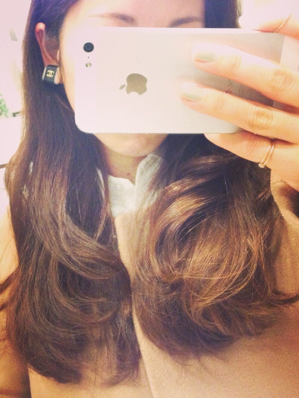 セールで買ったベージュのコート。 ヴィンテージ シャネルのイヤリング。