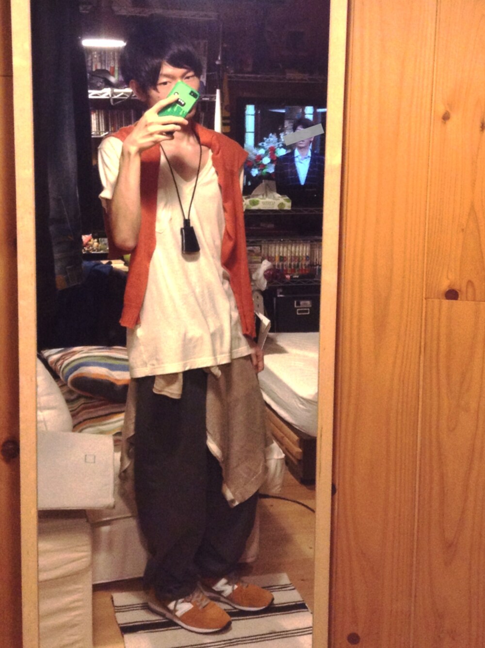wearやってなかったらしてなかっただろう 遊びのチャレンジスタイリング。 どうか生暖かくお見守りくださいm(_ _)m 今回は、 大仰にもこのスタイリング完成までの メイキング文章を公開!! コンセプトは誰もやらなさそうな 僕ならではの、ちょっちかわった肩掛けコーデ♬ まず、肩掛けカーデタグを見た瞬間、 このオレンジカーデと昨年のB&Yコラボのオレンジニューバランスを合わせようと決めました。 で、イロコイ白Tと、最近ちょくちょく登場するベージュグラミチを合わせてオレンジ系ワントーンコーデに仕上げてみました。 でもまぁ、色以外はよく見る感じで、 インパクトは薄い。 ってことで、却下。 どうせなら誰もやってないことをやりたい!! と思い立ち、もう一捻り加えることに。 まず、カーディガンの掛け方を工夫しようと思ったんですが、思いついた掛け方は、すでに2名ほどのユーザーさんが実行してたので、即却下。 ちなみに、横向きに肩にかける掛け方です。 考えろ考えろ!! もっと斬新なアイデアを💡 次に試したのが、 カーディガン2枚使った2重肩掛けコーデ。 嵐・桜井くんのWパーカー的な 笑 桜井くんファンの方ごめんなさいm(_ _)m 掛け方もいろいろ工夫してみます。 悪くないけど、カーデばかりが悪目立ちする。。 パンツも変えてみたけど、トップスも変えてみたけど手持ちのアイテムでは上手くいかず。 サマーニットに肩掛けカーデっていうキチガイ(笑)なこともやったんですが、色が調和せず。。 このコーデも十分キチガイかもですが。。笑 とにかく、肩に2重掛けも却下。 でも、カーデ2枚使いは捨てたくなかった。 ってことで、一つは肩掛けもう一つは腰巻きに!! 2重掛けを試してる時点で、 パンツはすでにこのウィンドウペンワイドパンツをはいていました。 最後に、 Tシャツの袖を少しまくって、finishです♬ 〓 無理やりこじつけたポイント 〓 ❶ 白T&グレーウィンドウペンスラックスというキレイ目要素を持つアイテムなんだけど上下ともゆるいシルエット! ❷ 同系色?カーデ2枚使いでバランス調整 !! (たぶん、誰もやってないはず。) ❸ スポーティーとは無縁のスタイリングをニューバランスのスニーカーでハズシつつも、キレイ目要素のスエード素材、カーデと同じオレンジで統一感を出すことで、絶妙なバランスに!!! (革靴だとつまんない、他のスニーカーだとバランス破綻しそう。) と、偉そうなことをいろいろ書いてますが、 客観的にはどう映るんだろうと、すごくすごく不安です>_< 個人的にはカーデがもちょっとイイものだったら、とか思います。。 オレンジも旬な色というわけではないし。。 なんかパンプキンパイを食べたくなるくらい、めっっちゃ秋っぽいし 笑 王道の肩掛けでカッコいいコーデは よそにたくさんありますし!! でも、あえてそれとは全く違う方向にベクトルを振った自分を褒めてあげたい♬ みんな同じじゃつまんないよね(°_°) 心優しい方は是非ご意見ご感想なんかいただけると泣いて喜びます>_< もちろん、こんなコーデもありじゃね!? っと思って下さった方はsave頂けると 凄く凄く嬉しいですm(_ _)m ちなみに、 普段はここまで試行錯誤してコーデ組んでません。が、たまにはこーゆーのも楽しい♬ あと、オレンジにしたのにはもう一つ理由が! それは、 シンプルオシャレンジャー"おしゃおれんじ"になってみたかったから!! シンプルコーデに差し色で誰でもなれるそうですので興味を持たれた方はぜひ!! 詳しくは、りんごさんのところ参照ですd( ̄  ̄) リーダーはりゅーた☆さん♬ 最後までお読み頂き ありがとうございますm(_ _)m 次はたぶん土曜日に=3 TVに映ったフットの後藤さんには消えて頂きました 笑 長文書くのって大変だ。。