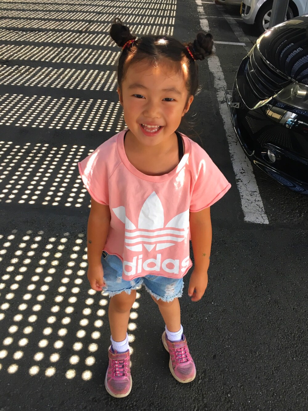ピンク系のスニーカーを着用したキッズの夏コーディネートの1枚目の写真