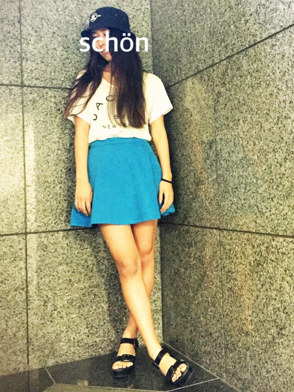 今回担当のIです! 今日はほんっとに、暑かったですよね´д` ; 夏を先取りして、ビビットカラーのスカートを合わせました! テーマは 【先取り!サマーガール】 です! パッと目を引くターコイズブルーのスカートをメインに、他のアイテムをモノトーンでまとめました! 定番アイテムばかりなので、流行りに流されない自分らしさをアピールです!