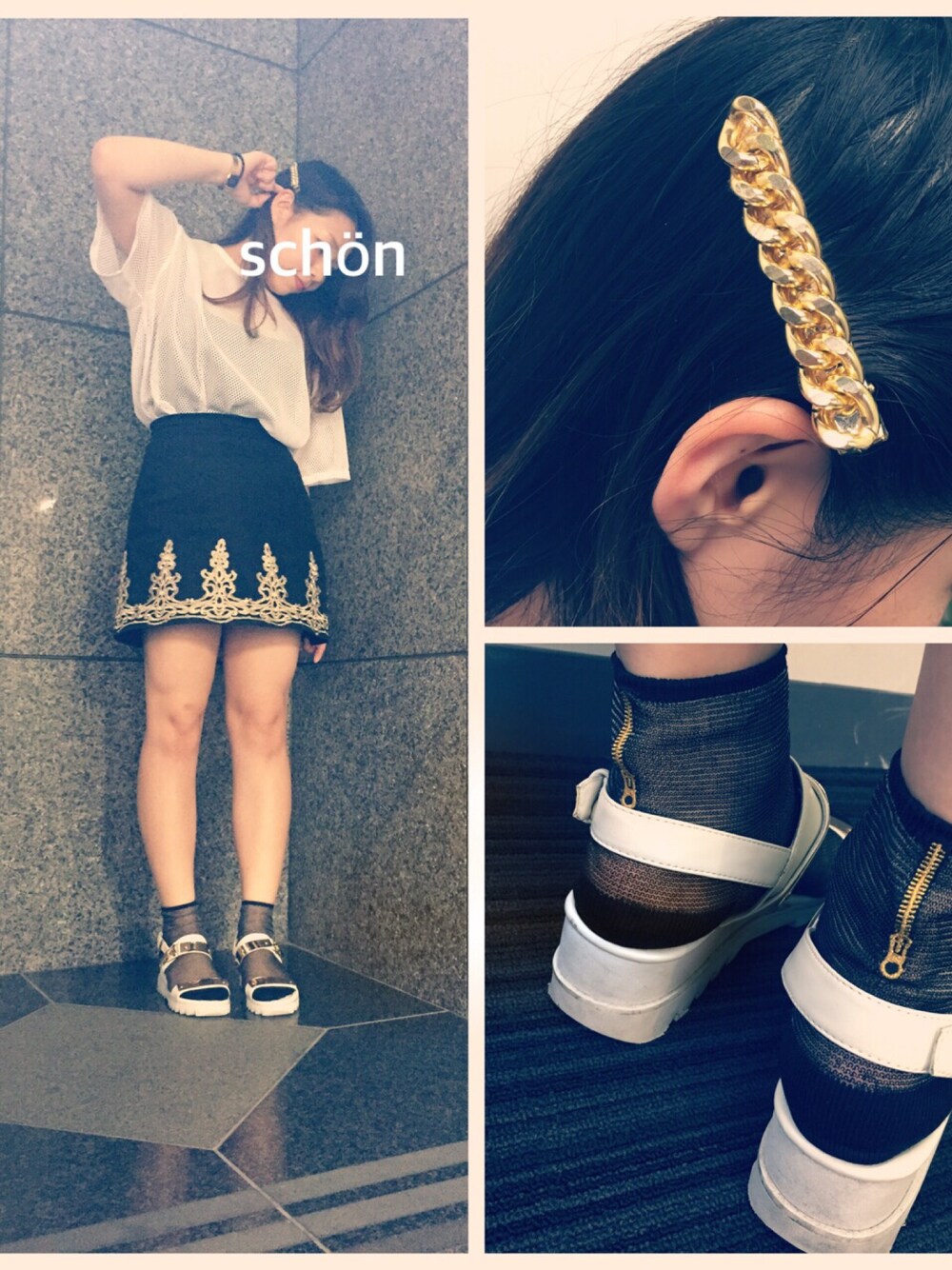 担当の藤田です! 今日も暑いですね… ということで、メッシュ素材のトップスで通気性をよく!! 【通気性抜群!メッシュでモードスタイル】 です! モノトーンのアイテムを中心に ゴールドを、アクセントにすることで 華やかな印象にしました! ポイントは、靴下のチャックです!笑
