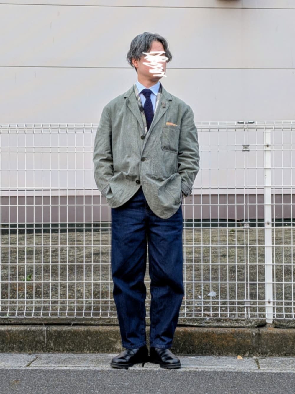 ヴィンテージのグリーンシャンブレージャケットを主役に、ネクタイ・スカーフ・革靴を合わせて、ワーカーがキメてみたイメージでスタイリング