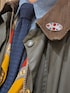シャンブレー、タイ、ジーンズはブルー系にして、グリーンのバブアーを羽織る。 黄色い面が見えるスカーフをワンポイントにした。