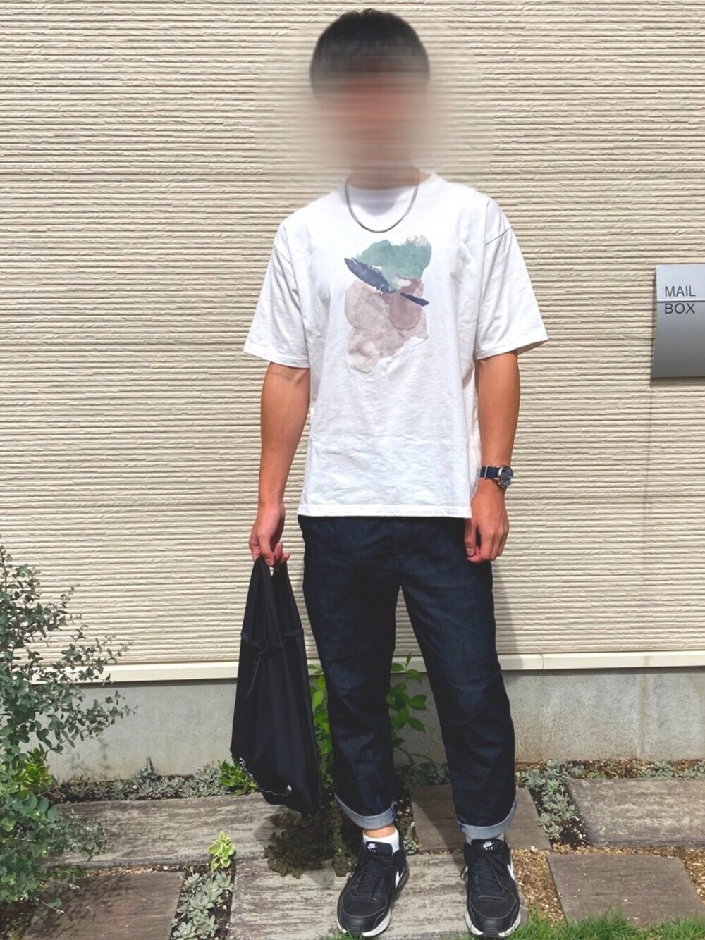 WYMのグラフィックTを着用。 パンツはGUのドライデニムイージーアンクルパンツ。 Tシャツに関しては、若干身体がごつめな僕はLサイズを購入した方がゆったりと着れたかもしれないです😓