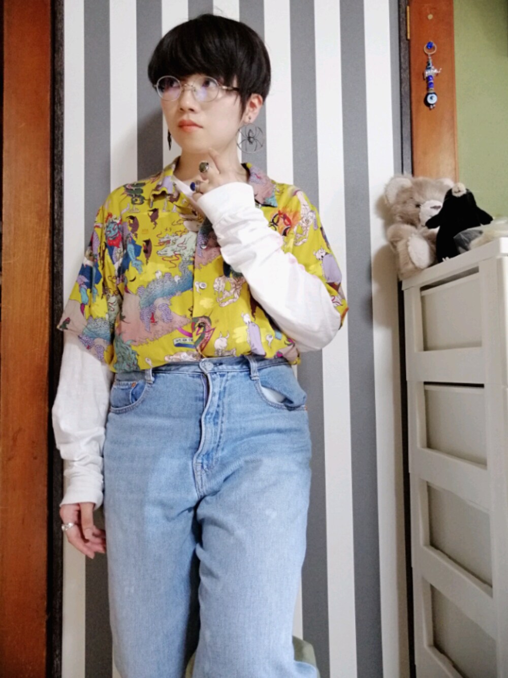右のはもぐらのぬいぐるみです イヤリングは蜘蛛で一目惚れで購入。しかし長袖はちと暑い、、