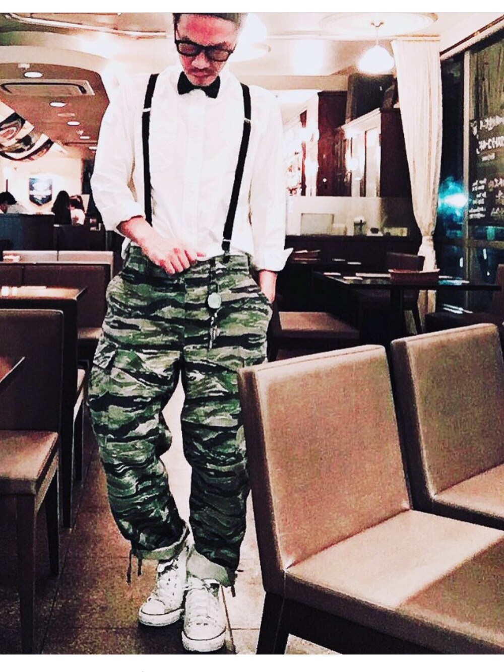 お友達の転職祝いにやってきました! 台風の後ですごく寒かった カーゴパンツをワイドパンツに見立ててサスペンダーと蝶ネクタイでコナンスタイル!