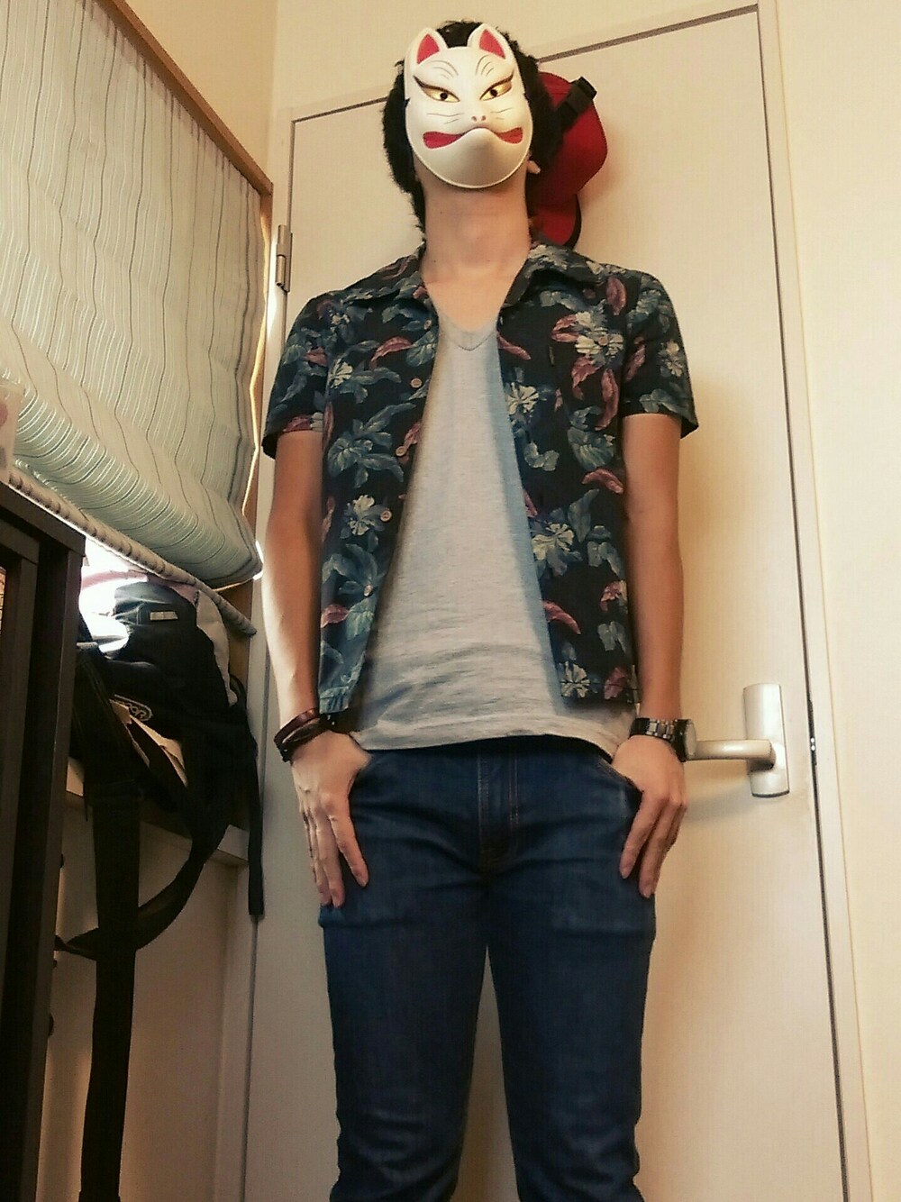 夏は終わったけれどアロハシャツ。 チャラくないです爽やかです。 キツネのお面がポイント。 職質待ったなし🙆🆒 外で撮りたいけどなかなか勇気が出ない今日この頃。